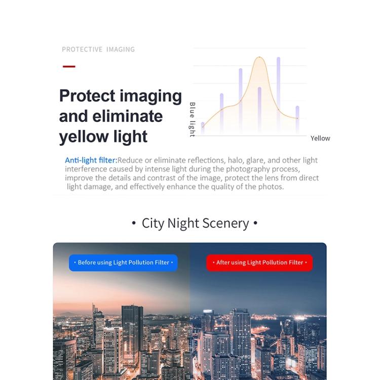 2. Each filter is made of high-definition optical glass, which has no impact on image quality. It has been ground and polished many times to form a low refractive index, ensuring the restoration of the true color of the image to achieve color-accurate photo shooting.