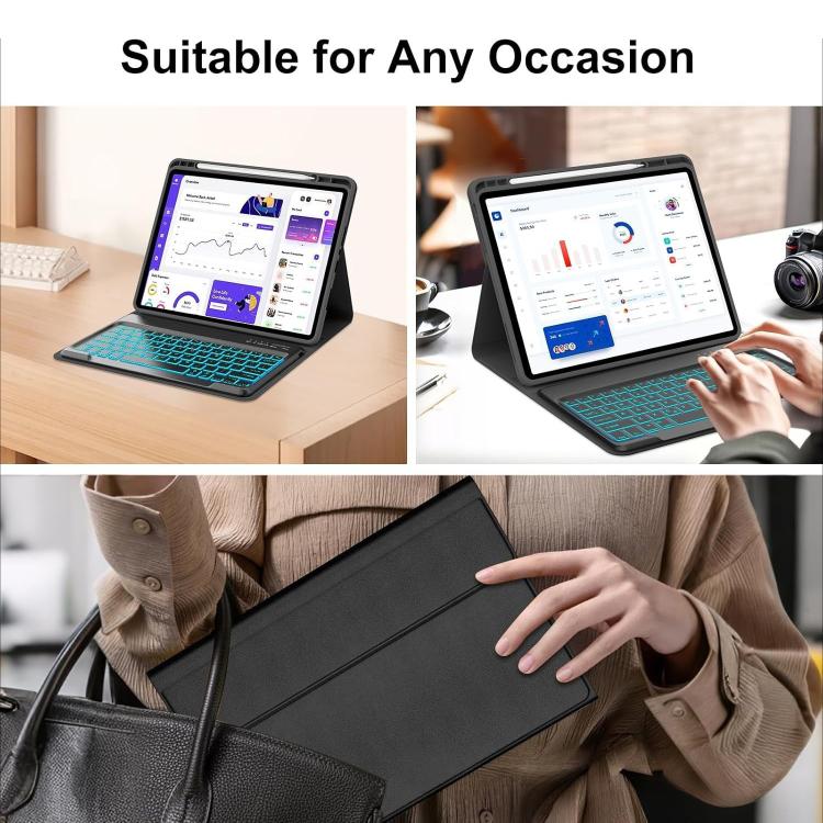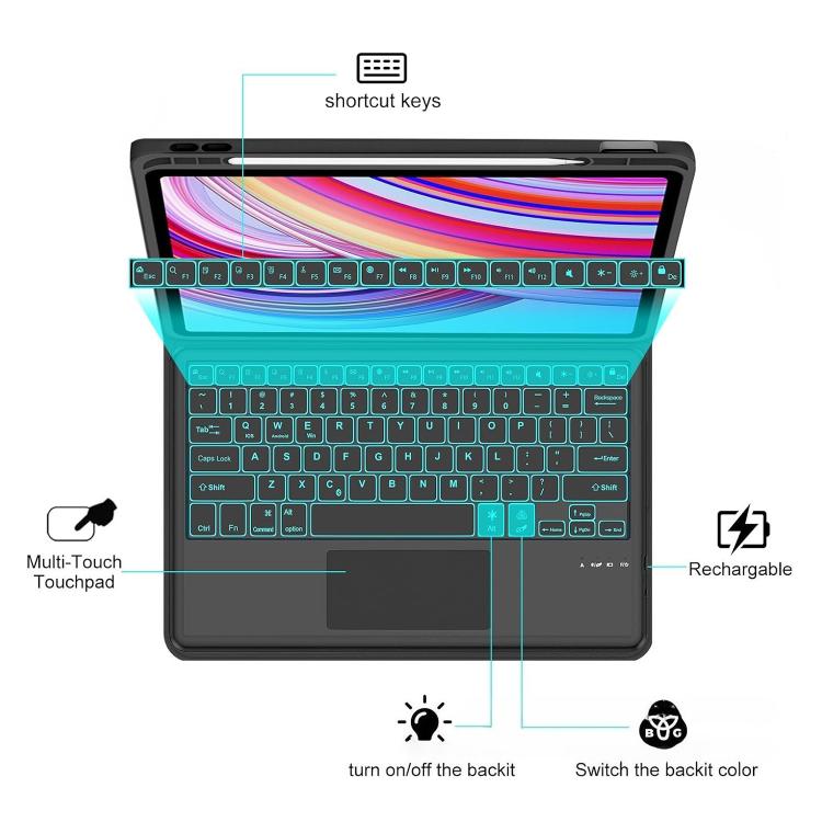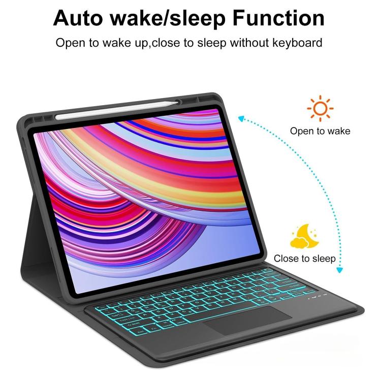 英文名称:For Redmi Pad Pro / Xiaomi Poco Pad Touchpad RGB Backlight Bluetooth Keyboard Tablet Leather Case with Pen Slot(Black) 中文名称:适用于红米 Pad Pro / 小米 Poco Pad 触控背光蓝牙键盘笔槽保护皮套(黑色)