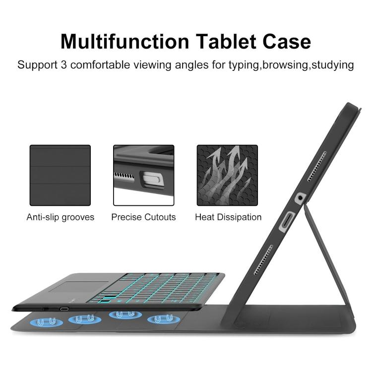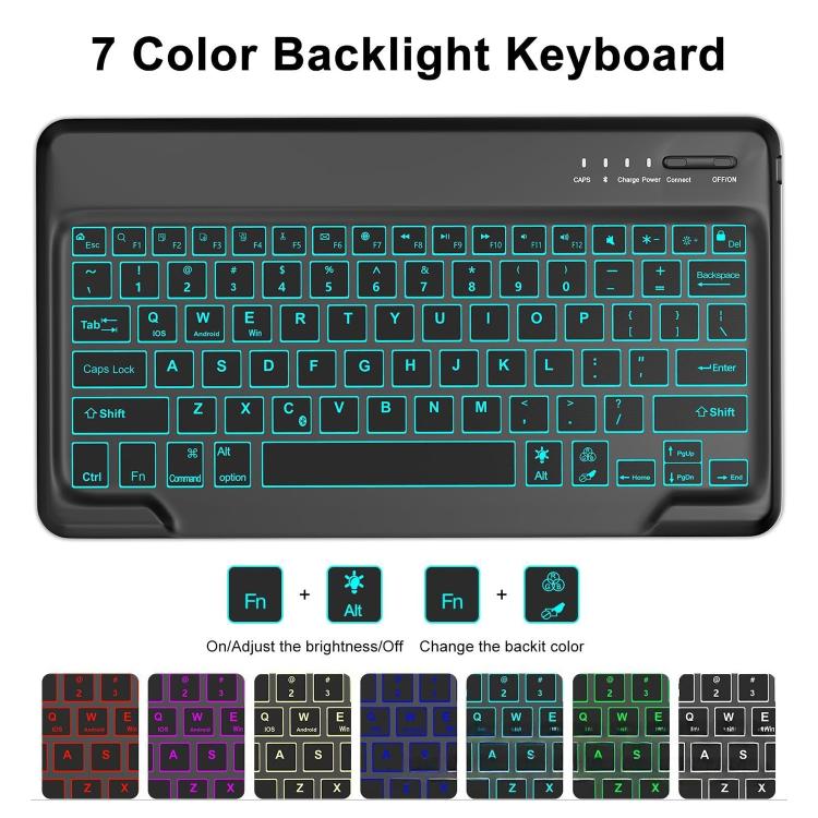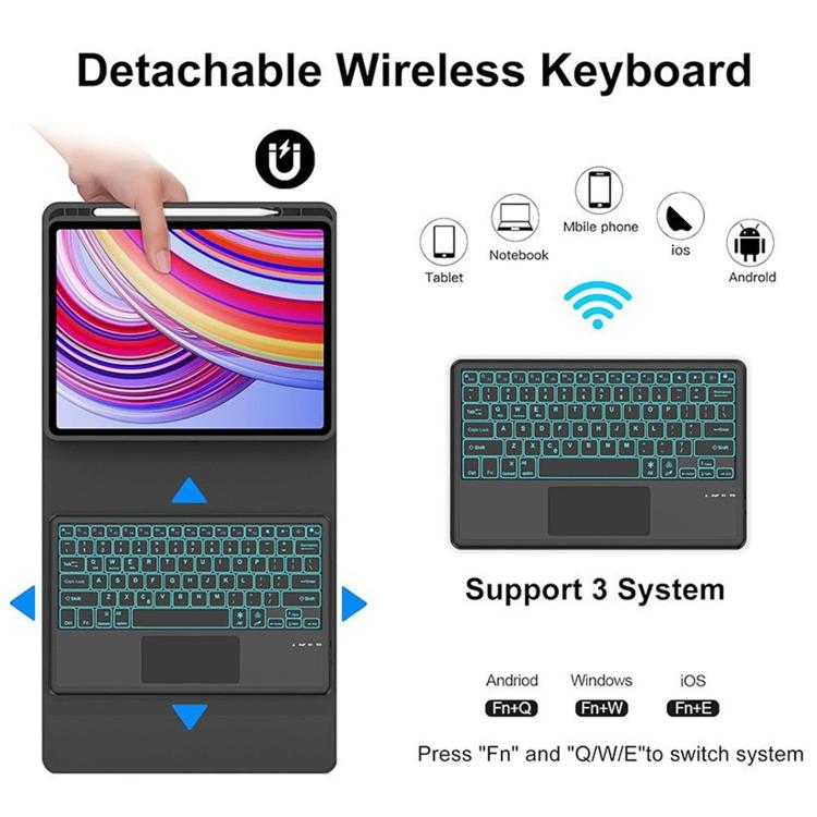 1. Supports sleep/wake-up function, environmentally friendly and power-saving. 2. Detachable keyboard, magnetic adsorption, more convenient to use. 3. All-round protection, to prevent the four corners of the equipment from bumping, wear and tear. 4. Low-noise keys do not disturb others. 5. Bluetooth chip, stable connection, fast speed and low power consumption. 6. RGB color backlight, fashionable and beautiful atmosphere 7. Press Fn+Q/W/E to switch between compatible systems.
