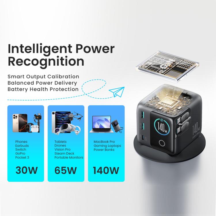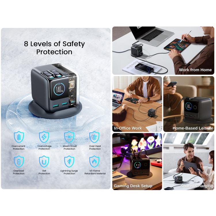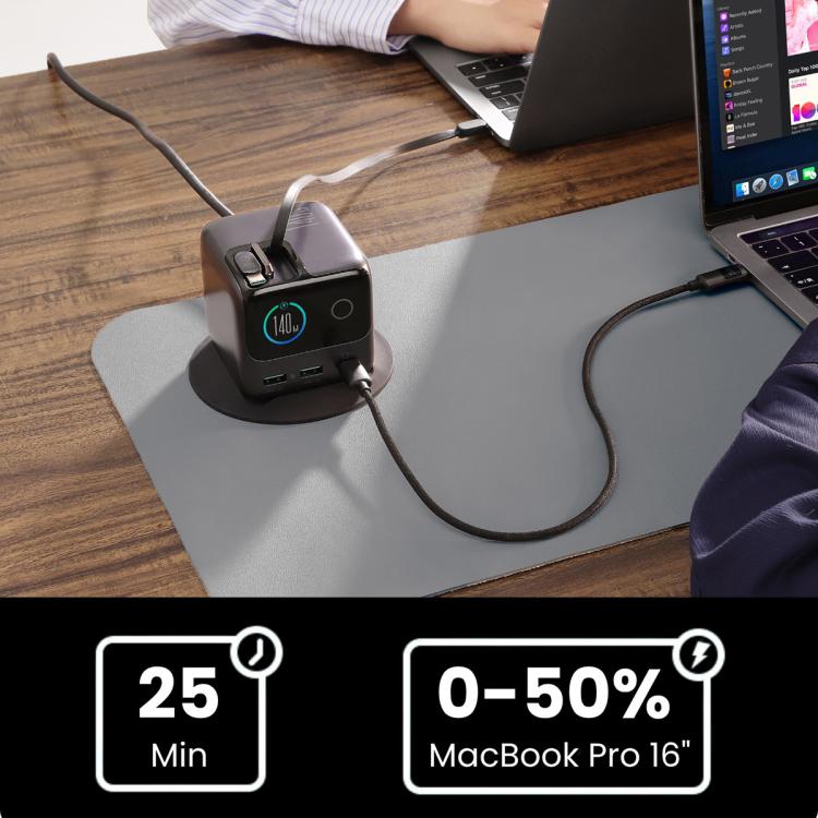 1. 140W 五口四通道快充,配备双 100W 伸缩线,线长 80cm,单手即可操作,带来高速快充与桌面一体化的极致体验;