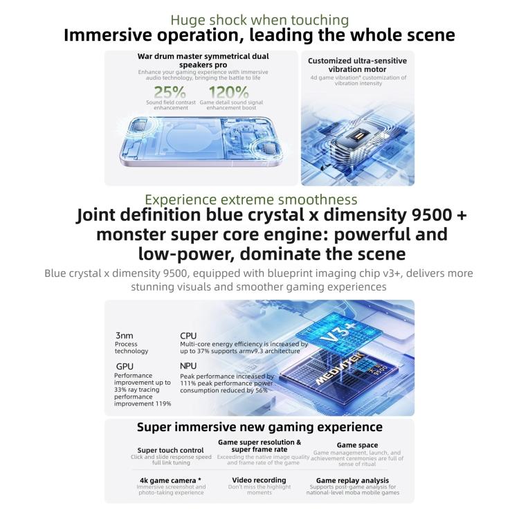 中文描述: 1. CPU:天玑 9500,64位,八核,3nm工艺,4.21GHz x 1 + 3.5GHz x 3 + 2.7GHz x 4