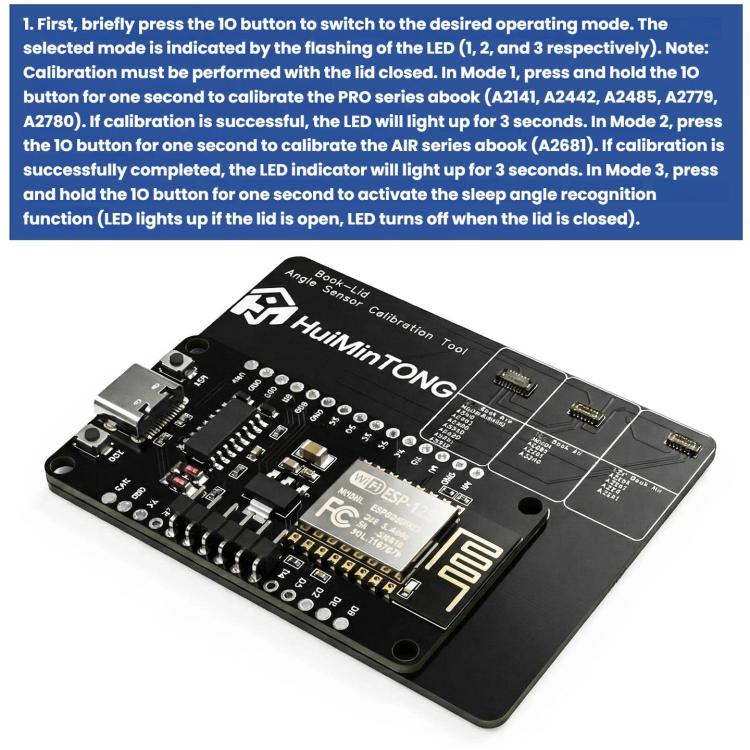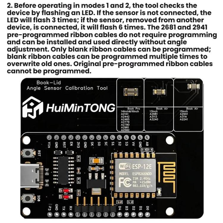 1. Briefly press the 10 key to switch to the desired operating mode. Determine the currently selected mode by the LED flash pattern (1, 2, or 3 respectively). Note: Calibration must be performed with the cover closed. In Mode 1, press and hold the IO key for one second to calibrate PRO series models A2141, A2442, A2485, A2779, and A2780. If calibration succeeds, the LED will illuminate for 3 seconds. In Mode 2, press the IO key for one second to calibrate AIR series model A2681. If the calibration record is successfully completed, the LED will illuminate for 3 seconds. A2780. If calibration succeeds, the LED will illuminate for 3 seconds. In Mode 2, press the IO button for one second to calibrate the AIR series A2681. If calibration records are successfully completed, the LED indicator will illuminate for 3 seconds. In Mode 3, press and hold the 10 key for one second to activate the sleep angle recognition function (LED illuminates when the cover is open; LED turns off when the cover is closed) 2. Before operating in Modes 1 and 2, the tool checks the device via LED flashes. If no sensor is connected, the LED flashes 3 times. If a sensor removed from another device is connected, it flashes 6 times. 2681 and 2941 models with pre-programmed ribbon cables require no programming and can be installed directly without angle adjustment. Only blank ribbon cables support reprogramming; these can be reprogrammed multiple times to overwrite previous settings. Original pre-programmed ribbon cables cannot be reprogrammed 3. Compatible Models: - For MacBook Pro 14-inch / 16-inch: A2141, A2442, A2465, A2779, A2780, A2961, A2592 - For MacBook Air 13-inch: A2981, A3115, A3240 - For MacBook Air 15-inch: A2941, A3114, A2241 4. Weight: about 19.7g 5. Size: about 6.9 x 5.2cm