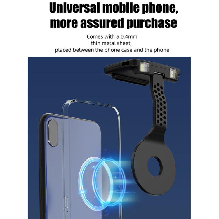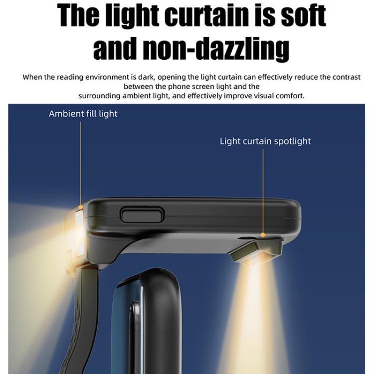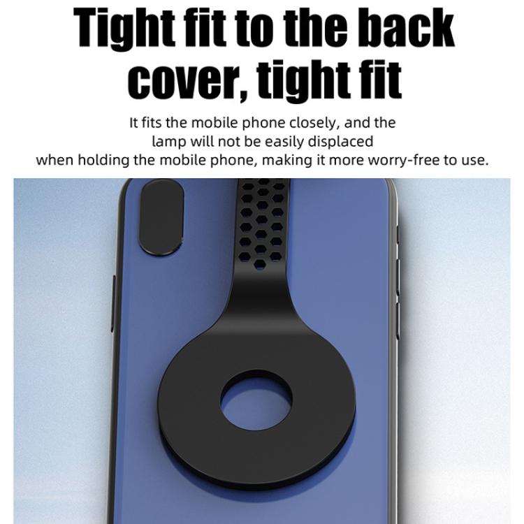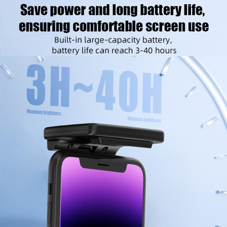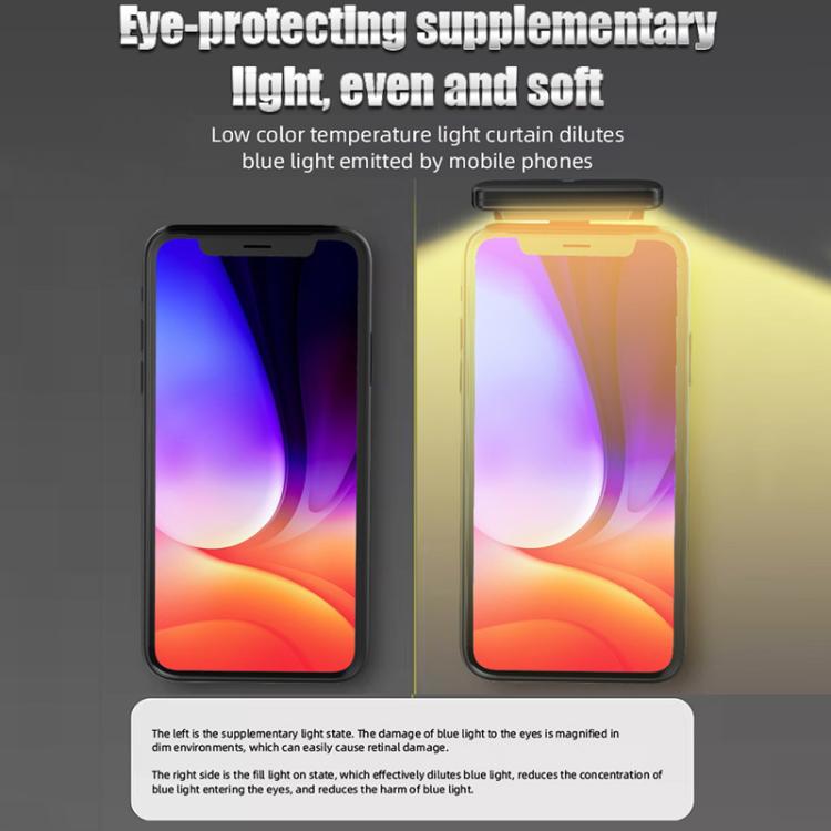 1. Material: ABS + aluminum alloy 2. Battery: built-in polymer lithium battery 3. Light color: warm light 4. Interface: Type-C charging 5. Eye-protecting auxiliary light source, uniform and soft low color temperature light screen, which can dilute the blue light emitted by the phone and protect the eyes. 6. When the reading environment is dark, turning on the light screen can effectively reduce the contrast between the phone screen light and the surrounding ambient light, thereby effectively improving visual comfort. 7. Adopting a directional light source structure to ensure that the required illumination range is always covered. 8. Strong magnetic adsorption, making the function more convenient, automatically adhering to the back cover of the phone. 9. It fits snugly with the phone, and the light will not easily shift even when holding the phone, making it more reassuring to use. 10. The lamp head has a 90-degree foldable design, making storage more convenient. 11. Touch control, one-click to activate eye protection mode, one click to turn on the front light, two clicks to turn on both the front and rear lights, three clicks to turn off the light, and so on. Long press to adjust the brightness. 12. Saves power, extends battery life, and ensures comfortable screen use. It features a built-in high-capacity battery that provides up to 3 to 40 hours of battery life. 13. Weight: Approximately 55g